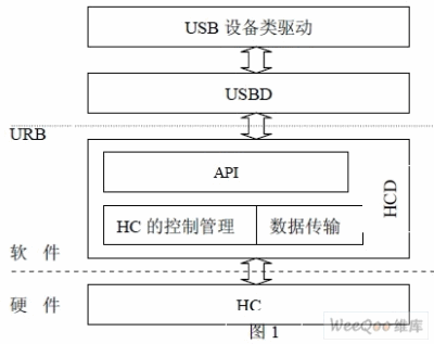 USB 主机控制器驱动程序(HCD)是USB 软件协议栈最底层一部分。HCD 向上仅对 USBD 提供服务,HCD 提供一个软件接口,即HCDI(HCD Interface),接受USBD 的调用和 管理。HCD 通过HC 的操作寄存器和通信域来管理HC 和实现USB 数据的传输。HCD 具体 实现如下: