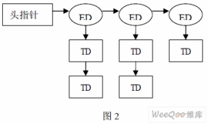 OHCI 规范中定义了4 个链表:控制传输数据链表,批量传输数据链表,完成数据链表 和周期性数据链表,其中除了完成数据链表是一维链表外,其他的链表都是二维链表(如图 2 所示),主要由数据结构TD 和ED 组成。主机控制器硬件通过寄存器访问每个链表来得到相关的USB 数据包,并将其发送到USB 总线上。主机控制器驱动程序则根据实际的数据传 输需要,构建相应的ED 并将要传输的数据转为TD 格式,所有的同类型ED 被连接在一起, 而TD 表述才是最终要在USB 总线上传输的数据包,同时属于同一个USB 设备端点的TD 被链接在一起,并挂在相应的ED 上。
