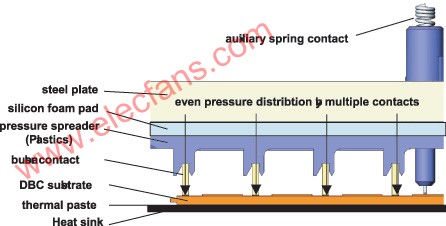 图2,Skiip技术使用压接代替大面积的焊接,消除了焊点的疲劳损坏和性能恶化。而多元压接也能保证低热阻和电阻。