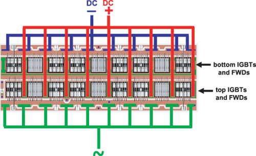 图3示出了带有IGBT和续流二极管(FWD)的高压SKAI模块结构原理。顶层和底层开关单板上的IGBT和续流二极管被放置在一块基片上,开关器件和续流二极管之间的距离很短,这种结构设计的另一个优点就是在并联的功率开关器件之间形成均匀的电流分布。