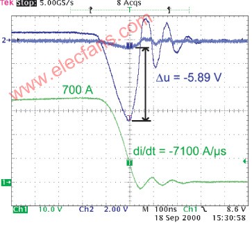 图4是MOSFET一个管脚的寄生电感的测试结果。测试时所施加的电流坡度为7100 A/μs,测到的峰值电压ΔV 为 5.89 V,根据ΔV = L ·di/dt的关系式,可以得到L = 0.83 nH,这与仿真的结果0.9 nH相当吻合。
