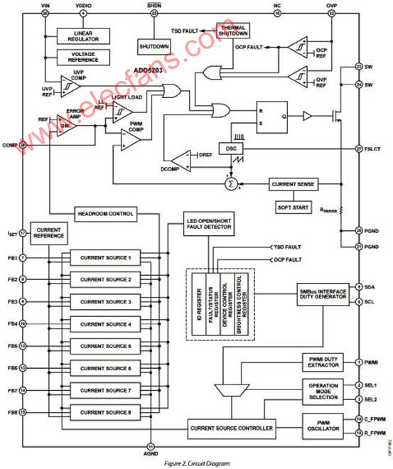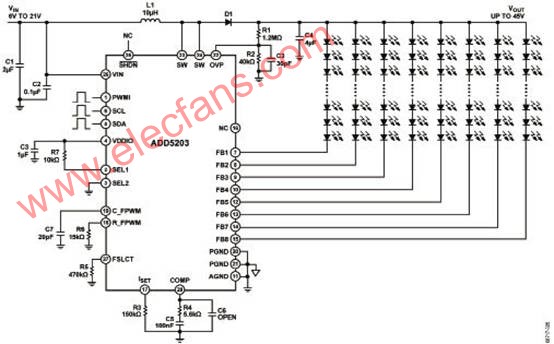 ADD5203包含8个调节电流源,从而保持亮度的一致性。每个电流源可以由30mA电流驱动,通过外部电阻可在引脚处调节LED驱动电流。ADD5203可以驱动最多8个多路串行连接的LED串,每串LED之间的电流匹配误差为±1.5%。