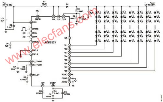 ADD5203是ADI公司的集成了SMBus和PWM输入的8串白光LED(WLED)驱动器,采用电流模式、升压转换器技术,主要针对背光应用。该驱动器具有0.15Ω、2.9 A的内部开关,引脚处可调节的工作频率范围在350kHz到1MHz之间。