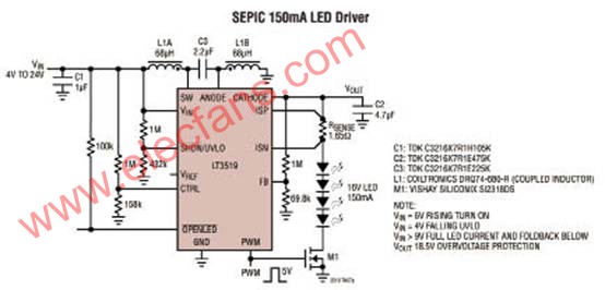 当LED串的电压在输入轨电压范围之内时,需要SEPIC拓扑。SEPIC产生高的PWM调光比,而且还提供短路保护。图3所示的SEPIC在4V至24V的输入范围内以150mA的电流驱动16V LED。因为集成的箝位二极管的阳极(ANODE)是通过一个独立于NPN电源开关发射极(SW)的引脚引出的,所以耦合电容器非常容易插入两者之间。SW引脚承受的最高电压略高于输入电压与输出电压之和,因此45V/750mA的集成电源开关很好地满足了这些规格要求。