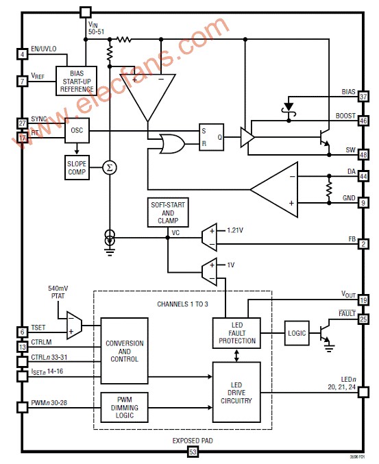 The step-down switching frequency is programmable between 200kHz and 1MHz and is synchronizable to an external clock. The LT3596 also provides maximum LED brightness while adhering to manufacturers’ specifications for thermal derating. The derate temperature is programmed by placing a negative temperature coefficient (NTC) resistor on the master control pin.