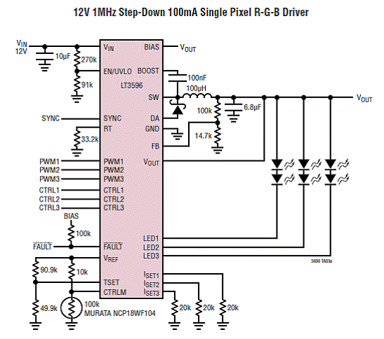 图4.LTR3596典型应用:12V 降压100mA 单象素RGB驱动器
