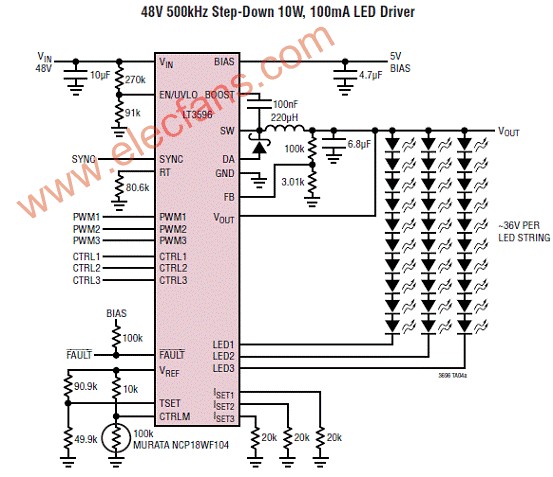 图5.LTR3596典型应用:48V 降压10W 100mA LED驱动器
