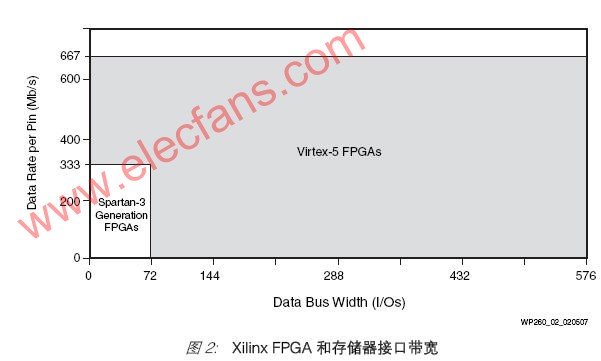 带宽是与每引脚数据速率和数据总线宽度相关的一个因素。Spartan-3 系列、Virtex-4、Virtex-5 FPGA 提供不同的选项,从数据总线宽度小于 72 位的较小的低成本统,到576 位宽的更大的 Virtex-5 封装(见图2)。