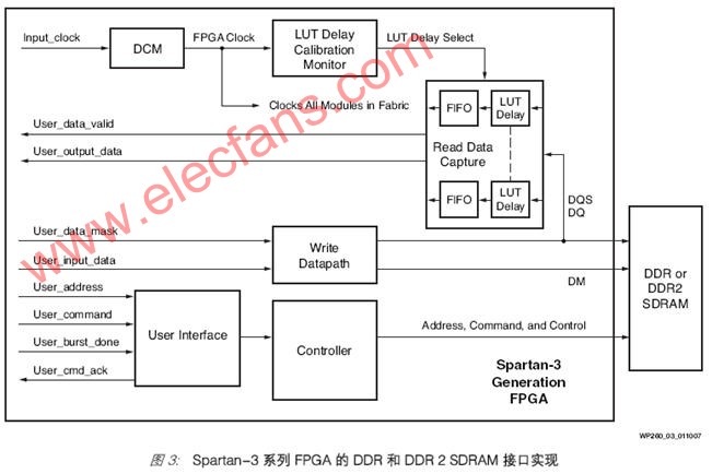 基于 FPGA 设计的存储器接口和控制器由三个基本构建模块组成:读写数据接口、存储器控制器状态机,以及将存储器接口设计桥接到 FPGA 设计的其余部分的用户界面(图3)。这些模块都在 FPGA 资源中实现,并由数字时钟管理器 (DCM) 的输出作为时钟来驱动。在 Spartan-3 系列实现中,DCM 也驱动查找表 (LUT) 延迟校准监视器(一个确保读数据采集具有正确时序的逻辑块)。延迟校准电路用来选择基于 LUT 的延迟单元的数量,这些延迟单元则用于针对读数据对选通脉冲线 (DQS) 加以延迟。延迟校准电路计算出与 DQS 延迟电路相同的一个电路的延迟。校准时会考虑所有延迟因素,包括所有组件和布线延迟。