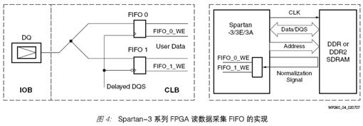 读数据的采集是在基于 LUT 的双端口分布式 RAM 中完成的(见图4)。LUT RAM 被配置成一对 FIFO,每个数据位都被输入到上升边沿 (FIFO 0) 和下降边沿 (FIFO 1)的FIFO 中,如图4 所示。这些深度为 16 个输入的 FIFO 异步运行,具有独立的读写端口。