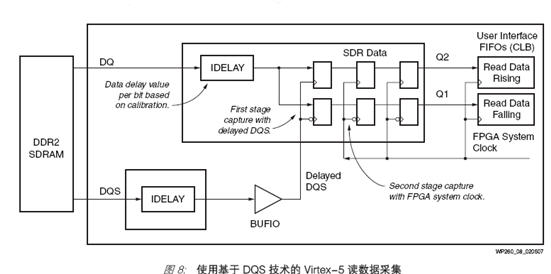 在更高的时钟频率下,“基于 DQS ”的采集方法就变得十分必要,其二阶段方法能提供更好的采集时序余量,因为 DDR 时序的不确定性主要限于 IOB 中触发器的第一级。此外,因为使用 DQS 来寄存数据,与时钟-数据 (Tac) 变化相比较, DQS -数据变化的时序不确定性要小一些。例如,对于 DDR2 而言,这些不确定性就是由器件的tDQSQ 和 tQHS 参数给出的。