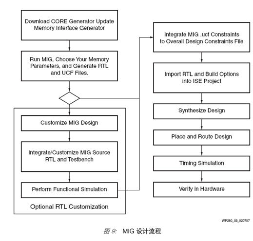 使用 MIG 软件工具可生成完整的设计。该工具作为 CORE Generator 参考设计和知识产权套件的一部分,可从 Xilinx 免费获取。MIG 设计流程(图9)与传统 FPGA 的设计流程非常相似。MIG 工具的优点是不必再为物理层接口或存储器控制器从头生成RTL 代码。