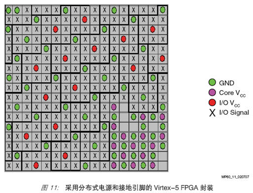 信号完整性的挑战在于控制串扰、地弹、振铃、噪声容限、阻抗匹配和去耦合,从而确保可靠的信号有效窗口。Virtex-4 和 Virtex-5 FPGA 所采用的列式架构能使 I/O、时钟、电源和接地引脚部署在芯片的任何位置,而不光是沿着外围排列。此架构缓解了与 I/O 和阵列依赖性、电源和接地分布、硬 IP 扩展有关的问题。此外,Virtex-4 和Virtex-5 FPGA 中所使用的稀疏锯齿形封装技术能对整个封装中的电源和接地引脚进行均匀分配。这些封装提供了更好的抗串扰能力,使高性能设计中的信号完整性得以改善。图11 所示为 Virtex-5 FPGA 封装管脚。圆点表示电源和接地引脚,叉号表示用户可用的引脚;在这样的布局中,I/O 信号由足够的电源和接地引脚环绕,能确保有效屏蔽 SSO 噪音。