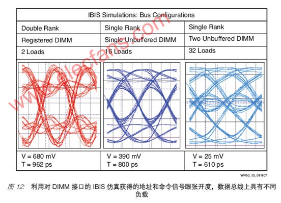 设计大容量或密集型存储器系统的另一个挑战是容量负载。高性能存储器系统可能需要由地址和命令信号共用的一条总线驱动的多存储器器件。大容量无缓冲 DIMM 接口就是一个例子。如果每个单列 DIMM 拥有 18 个组件,那么包含两个 72 位无缓冲DIMM 的接口可以在地址和命令总线上拥有多达 36 个接收器。由 JEDEC 标准推荐,并在通用系统中常见的最大负载是两个无缓冲 DIMM。总线上所产生的容量负载会极其庞大,导致信号边沿上升和下降需要多于一个时钟周期,从而使存储器器件的建立和保持出错。图12 所示为 IBIS 仿真所提供的眼图,使用的是不同配置:一个寄存DIMM、一个无缓冲 DIMM 和两个单列无缓冲 DIMM。容量负载的范围从使用寄存DIMM 时的 2 个接收器到使用无缓冲 DIMM 时的 36 个接收器不等。