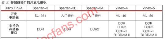 对参考设计进行硬件验证是确保解决方案严密可靠的重要最终步骤。Xilinx 已经验证了Spartan-3 系列、Virtex-4 和 Virtex-5 FPGA 的存储器接口设计。表2 所示为对于每一个开发板,所支持的存储器接口。