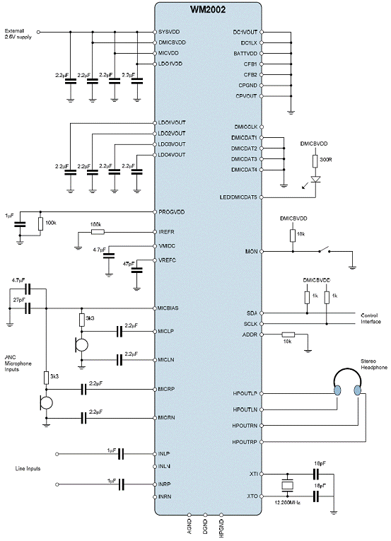 模拟播放或语音输入,模拟或数字麦克风。WM2002集成了功率管理,包括