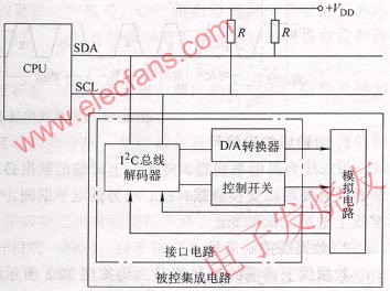 由I2C总线控制的集成电路或器件必须具有专用的总线端子,即SDA端子与SCL端子。凡是具有SDA、SCL端子(引脚)的集成电路或器件,均可以由总线控制。