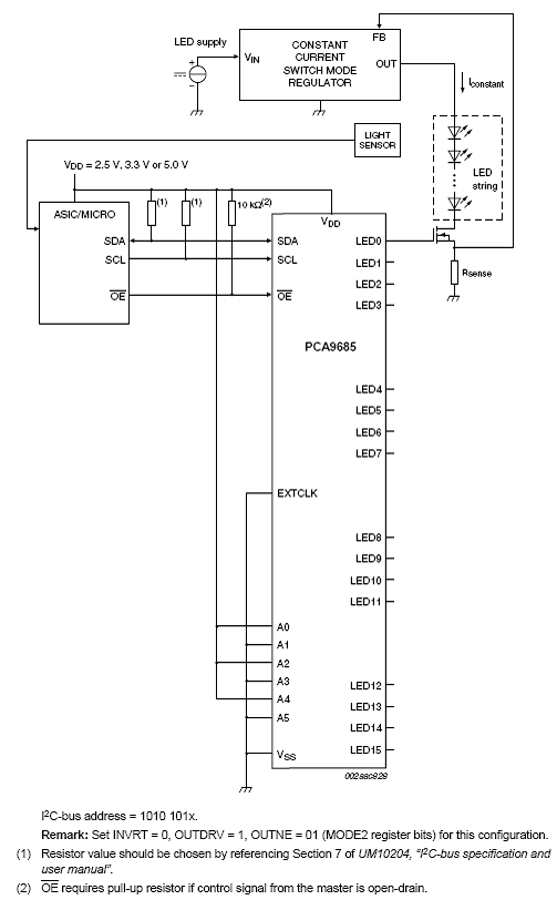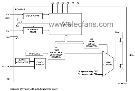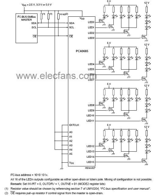 本文介绍了PCA9685主要特性和优势,方框图以及典型应用电路图和LCD背光应用电路图.NXP公司的PCA9685是16路12位PWM不是Fm+I2C总线LED控制器,每个LED输出有它独立的12位分辨率(4096步)固定频率PWM控制器,工作频率从40Hz到1000Hz,占空比从0%到100%.工作电压2.3 V 到5.5 V,主要用在RGB或RGBA LED驱动器,LED状态显示器,LED显示器,LCD背光和手机或手持设备的键盘背光.