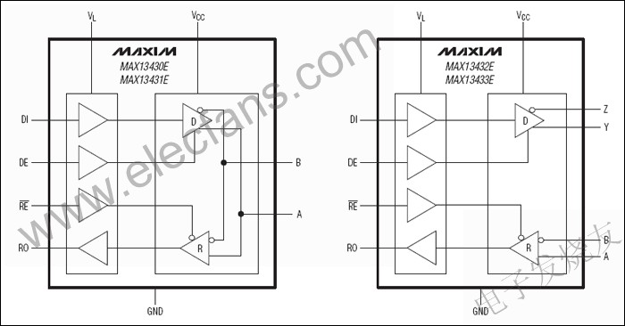 MAX13430E/MAX13432E具有简单的限摆率驱动器,有助于降低EMI,并降低由于不恰当的终端匹配引起的电缆反射,支持最高500kbps的无差错数据传输。MAX13431E/MAX13433E的驱动器摆率不受限制,可以支持最高16Mbps的传输速率。MAX13430E/MAX13431E专用于半双工通信,MAX13432E/MAX13433E则专用于全双工通信。