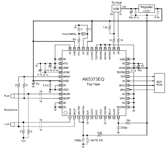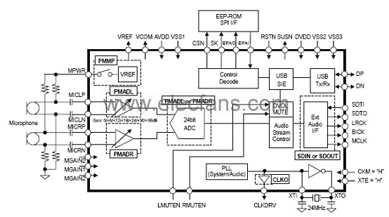 AKM 公司的AK5373是带USB 2.0接口的立体声模数转换器(ADC),包括有USB串行接口引擎,USB收发器,音频处理区块,端点以及24位立体声音频ADC。集成的PLL可使用多种取样频率,并集成了麦克风放大器和可编程增益放大器。工作电压3.0V-3.6V。本文介绍了AK5373主要特性,方框图,内部ADC流模式,外部音频处理模式以及系统连接框图,AKD5373-A评估板方框图和电路图与元件布局图。