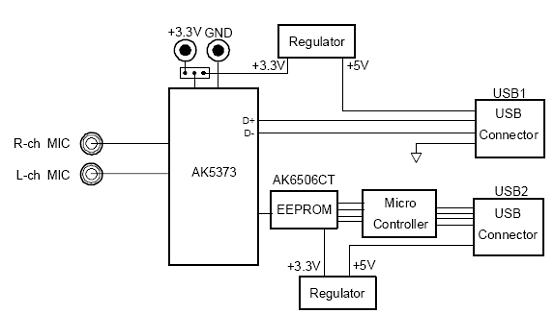 AKD5373-A is an evaluation board for AK5373, which is a stereo A/D Converter with a USB 2.0 interface. The AK5373 can be tested easily on the AKD5373-A, as the operation of the device is compatible with USB standard audio class. The AKD5373-A has not only an external audio interface, but also an external EEP-ROM that all descriptor contents are stored and customizable.