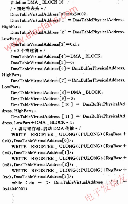 根据上面介绍的描述符表,下面给出一个链式DMA读的驱动程序例子。首先生成一个描述符表,然后把描述符表表头的4个字段的内容分别写入BAR2地址偏移量为0x0,0x4,0x8和0xC寄存器中。写完后即开始此次链式DMA读传输,while循环用于等待链式DMA结束。从下面的代码可以看出,2个描述符对应2次DMA操作。