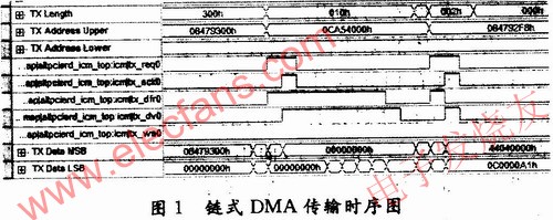 图1是用SignalTap工具获取的链式DMA读时序图。PCIE核接收tx_req0请求信号,然后给出一个tx_ack0,同时将tx_dr0置为有效,该信号套住的TXData就是需要读取的有效数据。在每次DMA结束之后,PCIE核都会用同样的控制逻辑给主机传送1个已完成DMA次数的状态字,如图1中的44040000h。