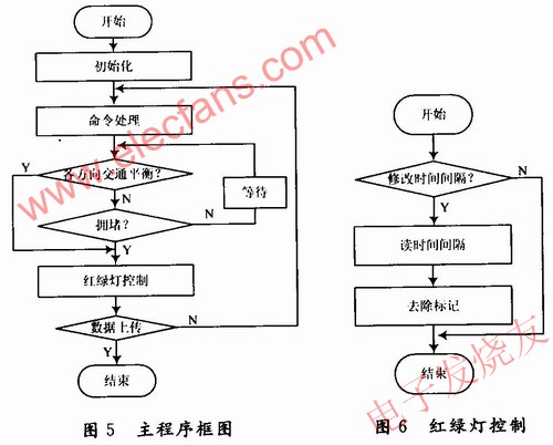 主程序根据中断程序返回的状态循环调用命令处理、交通状态判定和红绿灯控制模块,并定时调用数据上传模块。其流程图见图5。