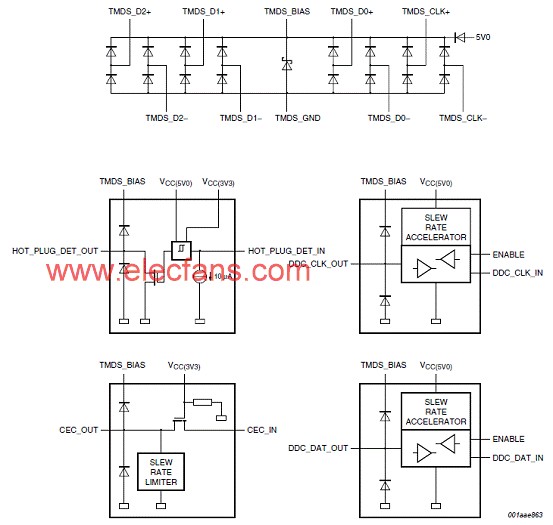 NXP公司的IP4776CZ38是全集成的HDMI接口器件,集成了电平转移,ESD和背驱保护等功能. IP4776CZ38和HDMI 1.3兼容,每路的线电容仅为0.7pF,线间隔和0.5mm匹配,提供可用于DDC时钟和数据通路的双向电平转移N沟FET, ESD保护±8 kV,主要用在TV,图像卡,STB,DVD,数字媒体适配器和游戏控制台.