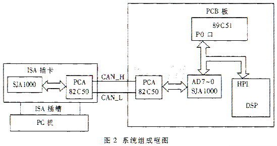 系统组成框图如图2所示。 ISA插卡通过ISA插槽与PC机(即相当于磁悬浮系统上的主控机)连接,受PC机的控制,接收来自PC机的数据,向PC机转发收到的数据。插卡上有SJA1000芯片,通过它与PCB板上的SJA1000实现数据交换。