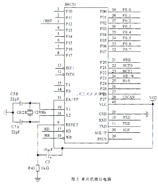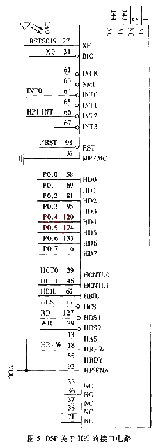 根据系统组成框图,各个具体模块的硬件实现如图3、图4、图5所示。 图3为单片机的接口电路,并口P0与SJA1000的并行数据口D0~D7(如图4所示)及DSP的HPI口(如图5所示)相连,实现数据交换:SJA1000接收来自CAN总线的数据,通过并行数据口D0~D7及P0口发送给单片机,单片机接收到数据并经过处理后又通过P0口和HPI口转发给DSP。 HBIL、HCT0、CHT1、HR/W为HPI口的控制信号?2?,故HPI的读写等操作都受控于单片机。 CSCAN为SJA1000的选通信号,/RST为SJA1000与DSP的复位信号;RD、WR分别为读写控制信号。