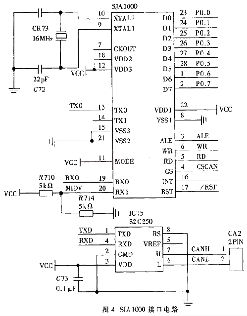 CB板上的SJA1000的数据/地址信号线与单片机的P0并口相连,同时P0并口也与DSP的HPI并口数据线HD0~7相连。在单片机的控制下,SJA1000接收来自PC机的数据,并将其通过P0并口发送给单片机,然后单片机再将这些数据通过HPI发送给DSP。