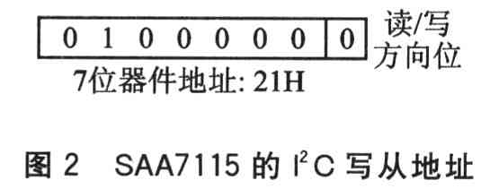 需要注意的是,在DM642的I2C应用中经常会遇到不能正确读/写从设备的问题。这是因为DM642对I2C模块的从地址寄存器设置不同于其他芯片的I2C应用。在标准I2C协议中,器件的7位地址格式要将地址和读/写方向位一同送入从地址寄存器。但是,DM642的I2C的应用中只需要向从地址寄存器中送入7位器件地址,读/写方向位由DM642自动生成。例如,SAA7115的标准I2C写从地址为40H,如图2所示。