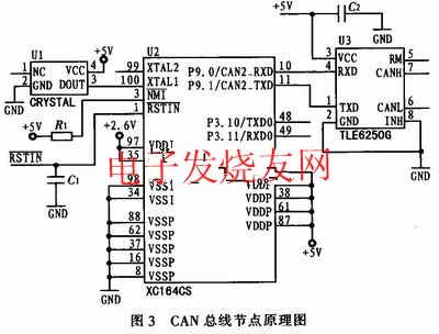 CAN总线收发器采用英飞凌公司的TLE6250G,支持传送速率高达1 Mb/s,具有抗瞬变、抗射频和抗电磁干扰的特性,并具有宽泛的工作范围(-40~150℃),以及短路保护和过温保护功能。具体的CAN总线节点原理图设计如图3所示。