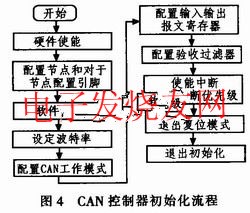 要实现CAN通信,首先要对CAN控制器进行正确初始化设置。初始化主要完成下面的工作:节点控制寄存器ACP/BCR的设定;CCE和 INIT置位;错误计数器最大值的设定;节点输出管脚的设定;节点传输速率的设定;给节点配置发送、接收消息体。对于XCl64CS,CAN控制器的初始化可以使用DAVE进行配置,来自动生成代码,也可以用户自行编写。初始化流程如图4所示。