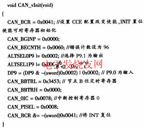 根据系统的实际情况未编写相应的软件程序。这里使用的XCl64CS单片机的CAN控制器遵循CAN V2.0B规范。报文缓存单元最多保存32个报文对象,每个对象的最大数据长度为8字节。每个报文对象有一个标识符和自己的控制和状态位集。通过控制相应寄存器来存放通信时发出或者接收到的数据以及报文寄存器组的设置。对报文寄存器进行初始化之后,报文缓存单元无需CPU监控就能够处理数据的接收和发送,简化了软件代码的编写。而CPU通过访问CAN控制器状态寄存器或者由CAN控制器以中断的方式通知CPU,即可得到当前通信状态,从而节省了CPU的占用时间。