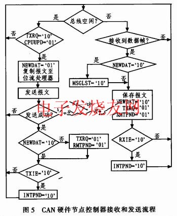 接收数据有查询方式或中断方式。这里采用中断方式,要实现的功能是:进入中断接收程序,判断中断是否是接受中断;若是将数据读出缓存器并进行判断,再进入相应的命令和数据处理函数。控制器接收和发送流程如图5所示。