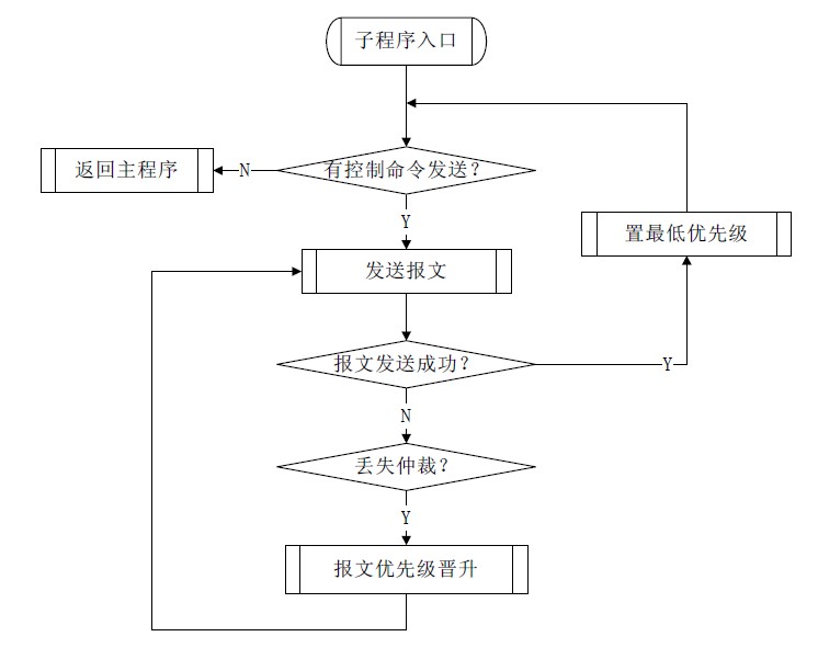 起动发送报文之后,MCU 须判断该网络节点是否已经成功发送了一条报文或者报文发送失败:首先,当SJA1000 中断寄存器出现了仲裁丢失中断或者发送中断,表明该节点已经处理完了一条报文,但是仍然不知道是否发送成功。如果成功,中断寄存器就没有仲裁丢失中断,但是会产生发送中断,因为发送成功后发送缓冲区会释放。如果发送不成功,一定是与较高优先级的协议帧竞争的结果,所以会有仲裁丢失中断。但是改为单次发送后,发送失败以后也会释放缓冲区,因此将同时产生仲裁丢失中断以及发送中断。在得到节点已经处理完一条报文后,只要用以上的规则进行判断就能知道上一条报文是否发送成功,也就是用来判断是否需要晋升节点所发送信息帧的优先级并重发该帧。