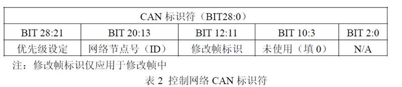 控制网络中产生的控制命令一般是猝发式的,对于控制系统而言必须确保控制命令被及时并且成功的发送,控制网络报文标识符定义如下表所示: