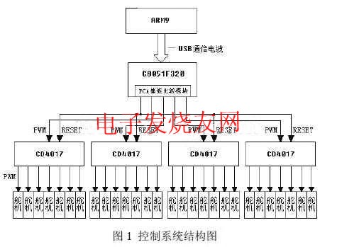 本文研究的小型仿人娱乐机器人运动控制系统由主控制器ARM9,C8051F320单片机与4片CD4017外部计数器构成的控制单元组成,控制结构简单灵活。USB通信方案满足了主从控制和通信速度的需求。关节执行机构采用舵机,控制方法简单实用。总体控制方式简图见图1。