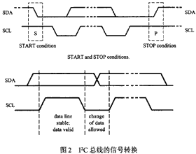 当所有器件的时钟信号都上跳为高电平时,低电平期结束,SCL线被释放返回高电平,即所有的器件都同时开始它们的高电平期。其后,第一个结束高电平期的器件又将SCL线拉成低电平。这样就在SCL线上产生一个同步时钟。可见,时钟低电平时间由时钟低电平期最长的器件确定,而时钟高电平时间由时钟高电平期最短的器件确定。在I2C总线技术规范中,开始和结束信号的定义如图2所示。当时钟线SCL为高电平时,数据线SDA由高电平跳变为低电平定义为“开始”信号;当SCL线为低电平时,SDA线发生低电平到高电平的跳变为“结束”信号。