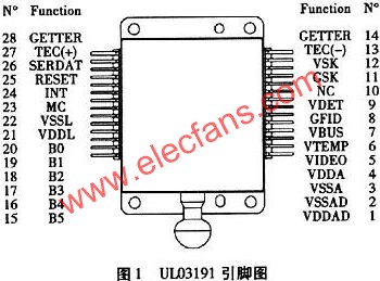 本电路采用的384×288像素非制冷红外焦平面器件为ULIS公司生产的非晶硅微测辐射热计UL03191,其主要由一个二维微测辐射热计阵列(FPA)和一个内部集成的热电制冷器(17EC)组成,热电制冷器通过对焦平面温度的精确控制使焦平面获得稳定的工作温度。ULO3191壳体外形紧凑,其像感面面积为9.6 mm×7.2 mm,重量≤25克,像元间距为25 μm,最高帧频100 MHz,带有一个