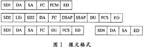Profibus-DP数据编码采用异步不归零制,传输线的空载电平为“1”。为了避免数据传输中发生冲突而导致数据丢失,在每个请求报文发送前必须保证33位(同步时间)的空载状态。在单个字符间所有数据传送时没有间隙,即无缝。各种报文的格式如图1所示。