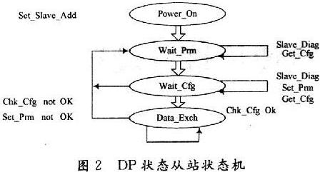 只有在power_on状态,从站可以接收来自二类主站的“Set_Slave_Address"报文,从而改变从站地址,从站应具有非易失性存储器来存储从站地址。内部启动后,从站进入wait_Prm状态,等待“Wait_Prm”报文。参数化报文由用户组态时给定,包括一些标准的信息,如识别号、同步锁定能力,还包括了一些用户特别定义的数据,另外,在此状态从站还可以接收“Get_Cfg”报文、“Slave_Diag”报文,但拒绝处理其他报文,不能进行数据通信。如果Set_Prm正确,从站进入wait_Cfg状态,等待“Check_Cfg”报文,该报文规定主站对它的配置信息,即数据交换中的输入输出字节数。此外,也可接收“Get_Cfg”报文、“Slave_Diag”的报文。当参数化与配置正确通信,在此状态,从站可以接收以下报文:Data_Exchange_Ok、Writing_outputs,Reading_Inputs,Global_Control,Slave_Diag,Get_Cfg等。从站接收主站的状态请求后,以高优先级的诊断报文作为应答。诊断信息包括了标准诊断信息和与用户有关的信息。