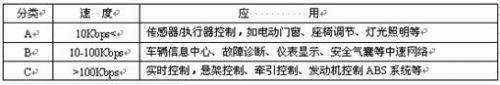 目前有分别适用发动机和底盘控制、车身电器控制、车载多媒体等不同场合的多种汽车总线标准。SAE(SocietyofAutomotiveEngineering)按传输速度的不同将汽车网络总线分为三类,如表1所示。
