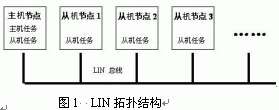 (由于过多节点将导致网络阻抗过低,一个LIN网络中节点总数不宜超过16。)主机节点既包括主机任务也包括从机任务,从机节点都只包括从机任务,如图1所示。主机节点也可以通过网关和其他总线如CAN连接。