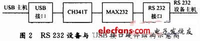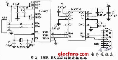根据原理框图,选择恰当的协议转换模块是设计该卡的关键。设计转换卡的方法有好几种:一种方法是采用通用的USB控制器,利用其内置的通用异步收发器(UART)在USB与RS 232之间进行信号转换,例如EZ-USB,PIC16C745,CY7C63001等,若没有内置UART,也可以利用通用I/O接口模拟RS 232的收发过程;另外还可以采用单独的USB接口收发器芯片,如ISP1581,PDI-USBD11/12等,但这种方法需要另配微控制器才能工作;第三种就是采用专用的USB与RS 232转换芯片,如CH341芯片,这种芯片的优点是数据接收和发送的协议转换工作全部由芯片独立完成,无需干预,也不用编写芯片的固件。本文采用CH341的简装版CH341T来设计USB-RS 232转换卡。图2是一个利用CH341T和MAX232进行USB接口设计的硬件框图。如图所示,该硬件系统由4部分组成:USB接口、CH341T、MAX232和RS 232接口。其中,USB接口用于连接USB主机,在此选用USB总线接口的A型连接头;CH341T用于完成USB接口转RS 232接口的所有硬件功能;MAX232用于完成RS 232与TLL/CMOS的电平转换;RS 232接口用于连接RS 232设备。根据实际需要,选择目前广泛应用的DB9连接器。
