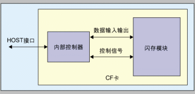 Compact Flash技术是由CF协会(CFA)提出的一种与PC机ATA接口标准兼容的技术。如图1,CF卡由两个基本部分构成:内部控制器和闪存模块。CF卡的闪存模块基本上都使用NAND型闪存,用于存储数据。内部控制器用来实现CF卡与主机的接口以及控制数据的传输。CF卡内部控制器的设计完全模拟硬盘,使用标准的ATA/IDE接口。