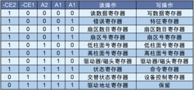 在True IDE模式下,某些信号有特殊的含义,必须采用True IDE模式下特有的设置方法。如表1所示,nCE1是任务文件寄存器片选信号,低电平有效;nCE2是交替状态(Alternate Status)寄存器和设备控制(Device Control)寄存器片选信号,也是低电平有效。因为实际操作中,极少使用交替状态寄存器和设备控制寄存器,所以对CF卡的操作实际就是对任务文件寄存器的操作。因此,一般设置nCE1=0,nCE2=1。实现方法:在CPLD中设置nCE1=SA_A4,nCE2=not SA_A4。这样设置是有根据的。表1是True IDE模式下I/O编码表。主机操作CF卡时,系统仅使用地址总线A2:0,用于选择组成任务文件寄存器的8个寄存器之一。而地址总线A10:3由主机接地。因此,nCE1=SA_A4即nCE1=0;nCE2=not SA_A4即nCE2=1。表1中,-CE1=0时,对应的8个寄存器统称为任务文件寄存器。