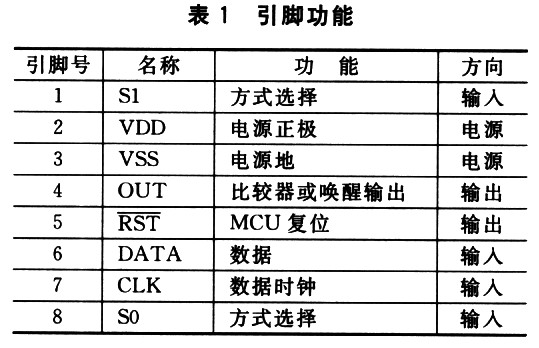 MPXY8020A的各个引脚如表1所列。MPXY8020A的片内电路通过引脚VDD(正电平)和引脚VSS(地)供电。在VDD与VSS之间,通常接1个0.1 ?F的电容进行电源滤波。OUT引脚在采样值高于电压比较器的极限值时,输出1;反之输出0。电压比较器的极限值由外部微控制器通过数字接口输入到MPXY8020A片内的8位DAC寄存器。当MPXYS020A工作于空闲状态时,OUT引脚被置高,直到14级分频器发生溢出时,该引脚输出一个负脉冲。RST引脚通常被置为高电平;当1O级分频器发生溢出时,被置为低电平。这个引脚通常用于使外部微控制器复位。10级分频器的溢出周期为52 min,这跟MPXY8020A的工作状态无关。S0和S1引脚一起,用于工作方式选择。在设置电压比较器的极限值时,DATA引脚为串行数据输入引脚。CLK引脚用于提供串行读写数据的时钟。向MPXY8020A写数据时,在CLK引脚信号的上升沿,串行数据从DATA引脚按时序送到片内移位寄存器,在CLK引脚信号的第8个下降沿,数据被送到片内D/A寄存器。S0、S1、DATA和CLK四个引脚都内置了施密特触发器,以提高芯片的抗干扰性,并且这四个引脚都内置了下拉电阻,所以当它们被悬空时,都为低电平。